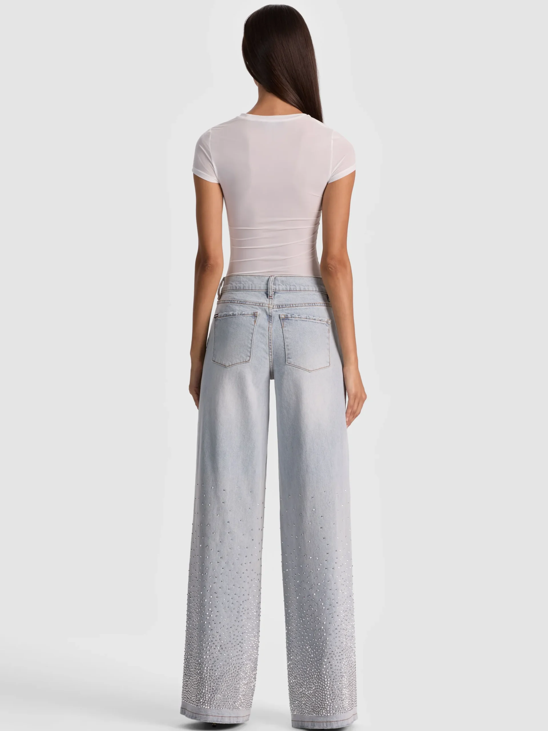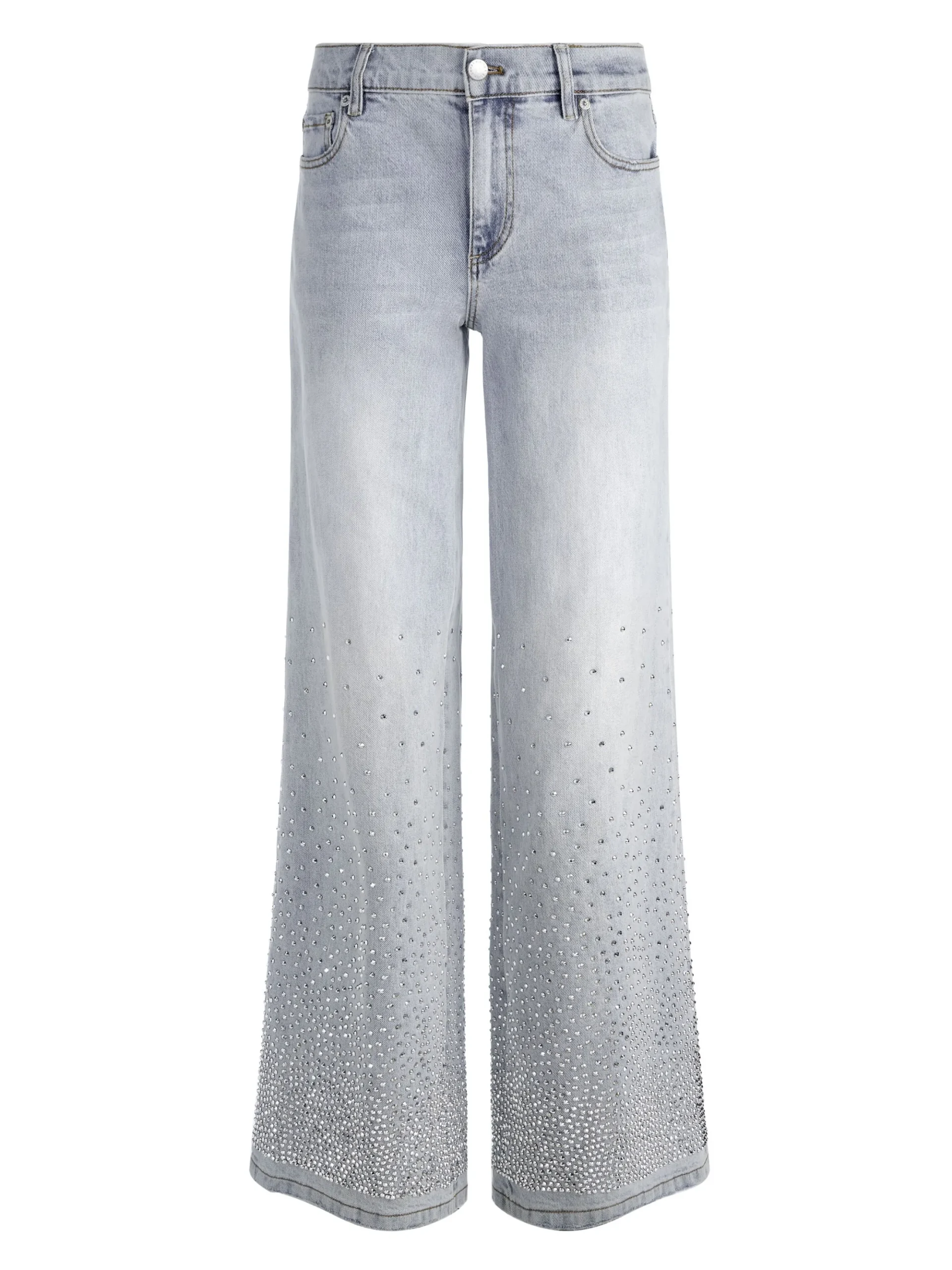 Introducing: The Amazing Jean. This low rise baggy jean perfects the wide leg silhouette with 98% cotton that drapes just right and feels even better with every wear. Shimmering heat-set crystals scattered throughout amp things up to rockstar status. Belt loops and a classic button-zip closure keep it timeless. Wear it slouchy, style it sleek–either way, you’ll look AMAZING.