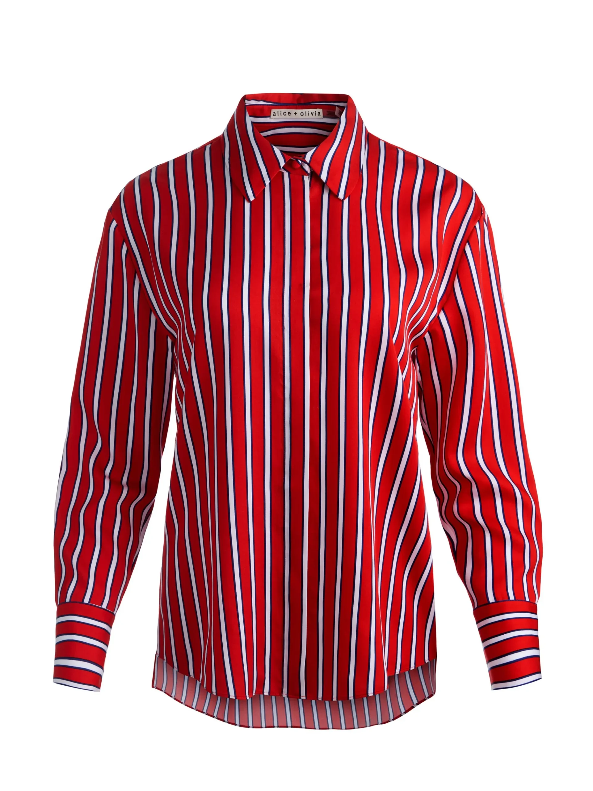 Effortlessly chic, our Dimitra red button down brings a modern twist to a timeless classic. The relaxed fit and high-low hemline drape beautifully, while the crisp collar and defined stripes add a polished finish. Crafted from a lightweight, silky Tencel, it feels as good as it looks–soft, breathable, and perfect for layering. Whether styled tucked into tailored trousers or left loose over denim, this versatile piece transitions seamlessly from work to weekend. Bold yet refined, it’s a staple you’ll reach for again and again.