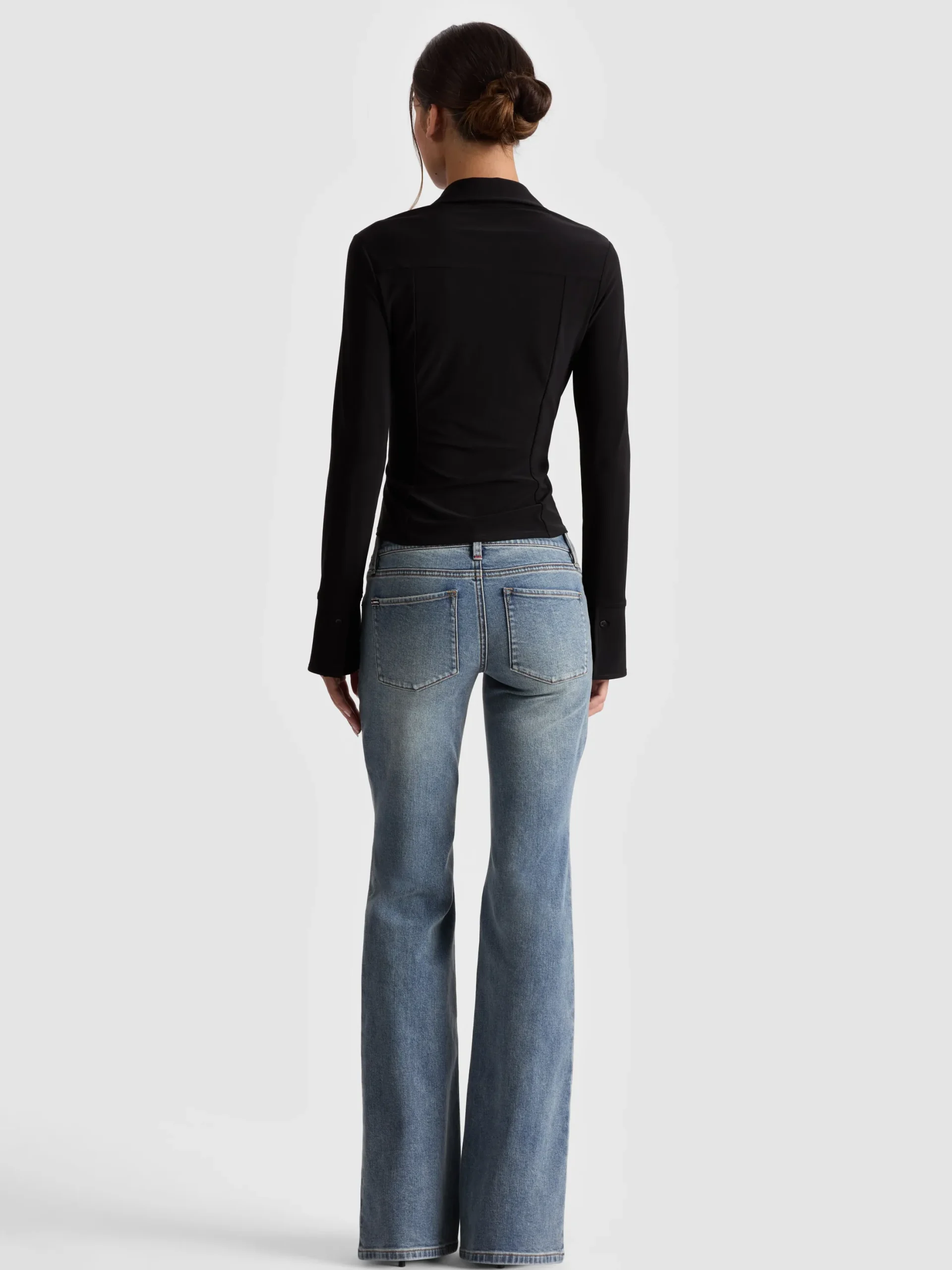 Sleek, sculpted, and endlessly flattering–meet Freya. This fitted black button-down top is crafted in our matte luxe jersey for a smooth, polished feel with just the right amount of stretch. Designed with a nipped-in waist and subtly flared cuffs, it hugs in all the right places while adding a touch of drama. Dress it up, dress it down–either way, Freya makes a statement.