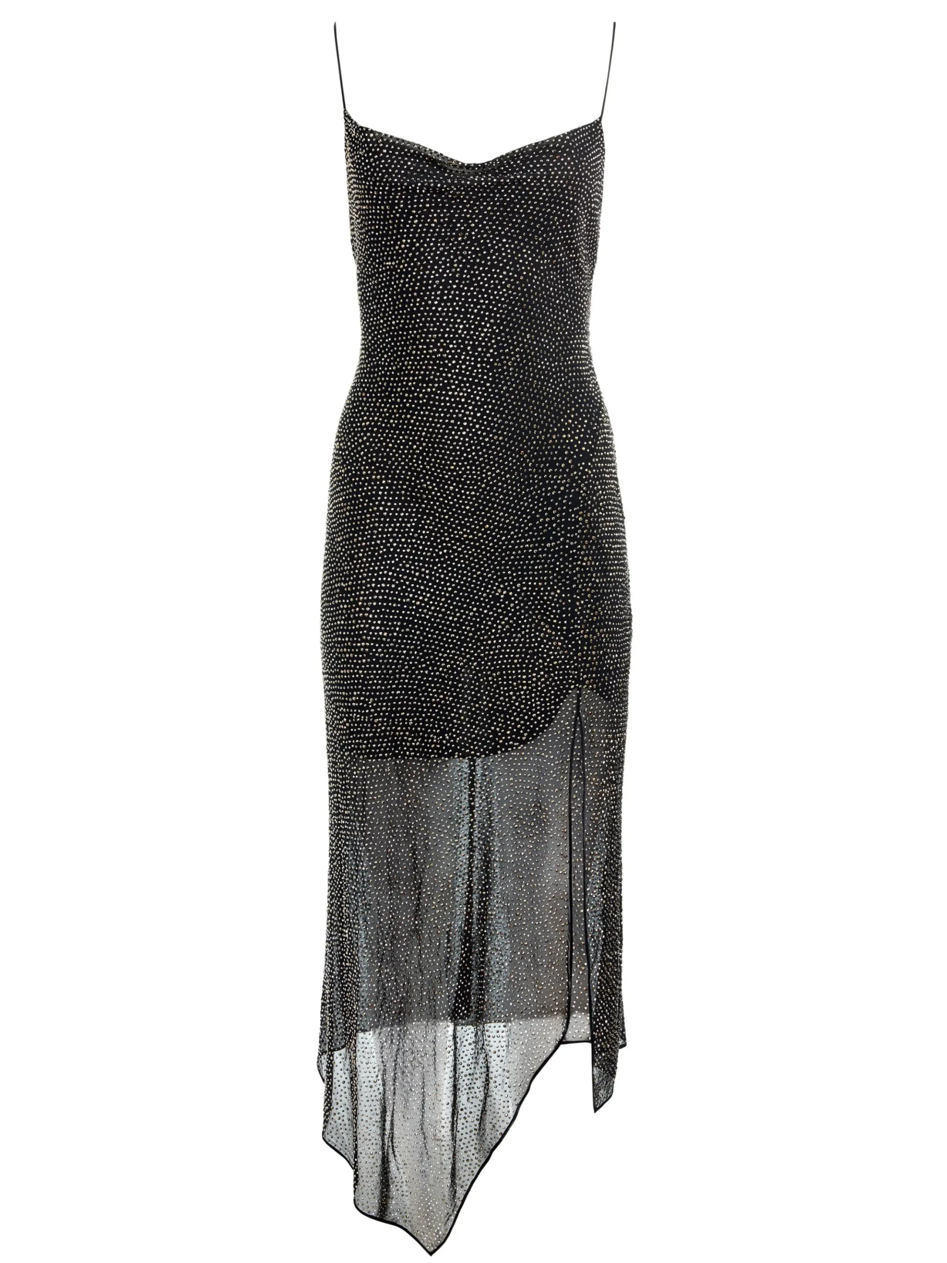 Harmony is an ethereal slip dress with a twist- its lightweight georgette is dusted in crystals that shimmer with every step. A draped cowl neckline and asymmetrical hemline add to its flowing elegance, while a thigh-high slit keeps it sultry. Designed to move like liquid, it catches the light beautifully on a dance floor. The perfect marriage of ease and extravagance, it’s made to shine.