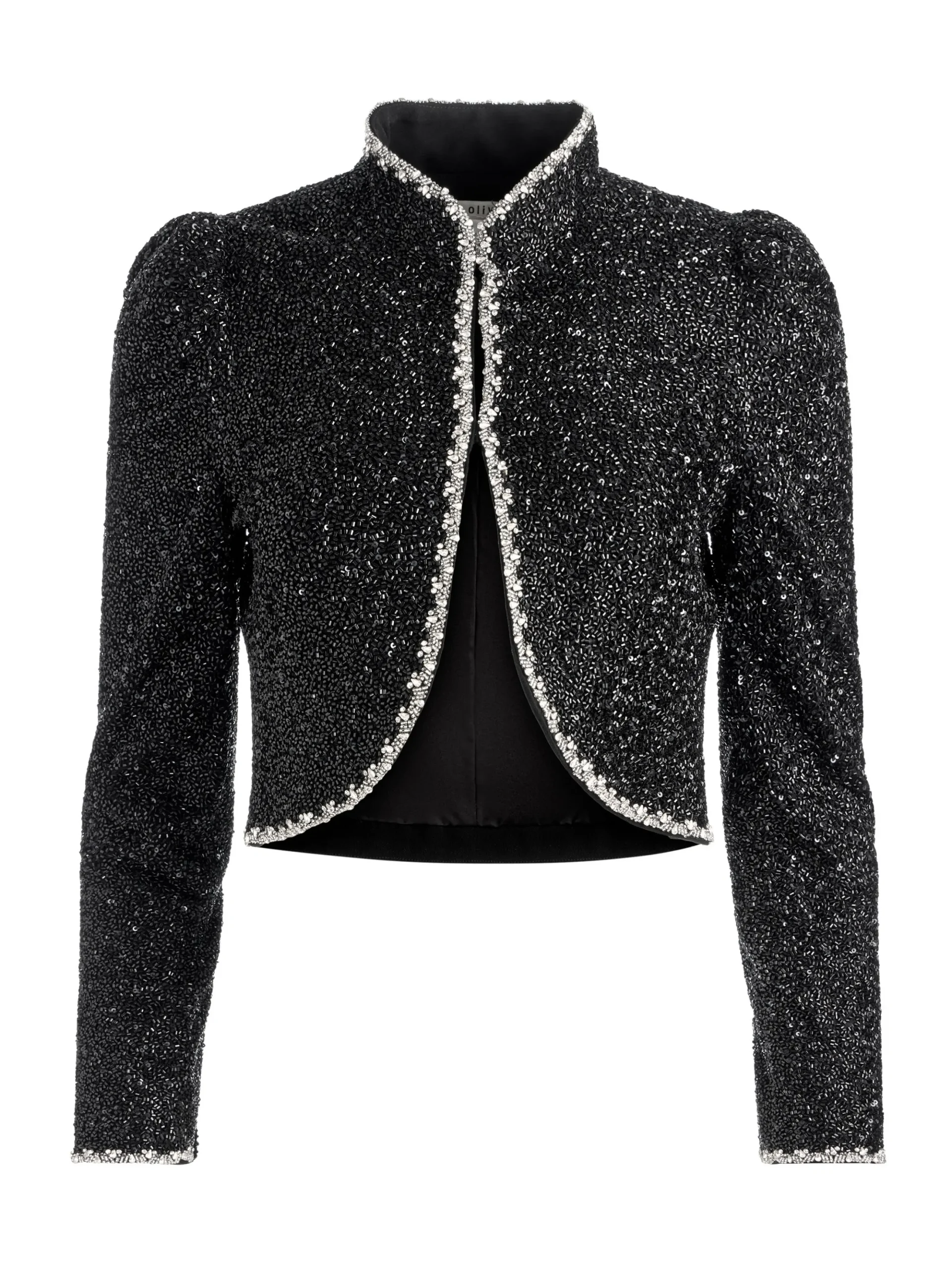 Introducing After Five, our new cocktail dressing collection–because it’s 5 o’clock somewhere. The Ilaria cropped evening jacket is distinguished by its intricately embellished tweed, well-defined silhouette and sweet feminine details. It’s impeccably tailored from a short length, close-fitting body and sculptural puff shoulders. Rounded hemlines expose a sliver of stomach while an elevated mock neck finishes the look.