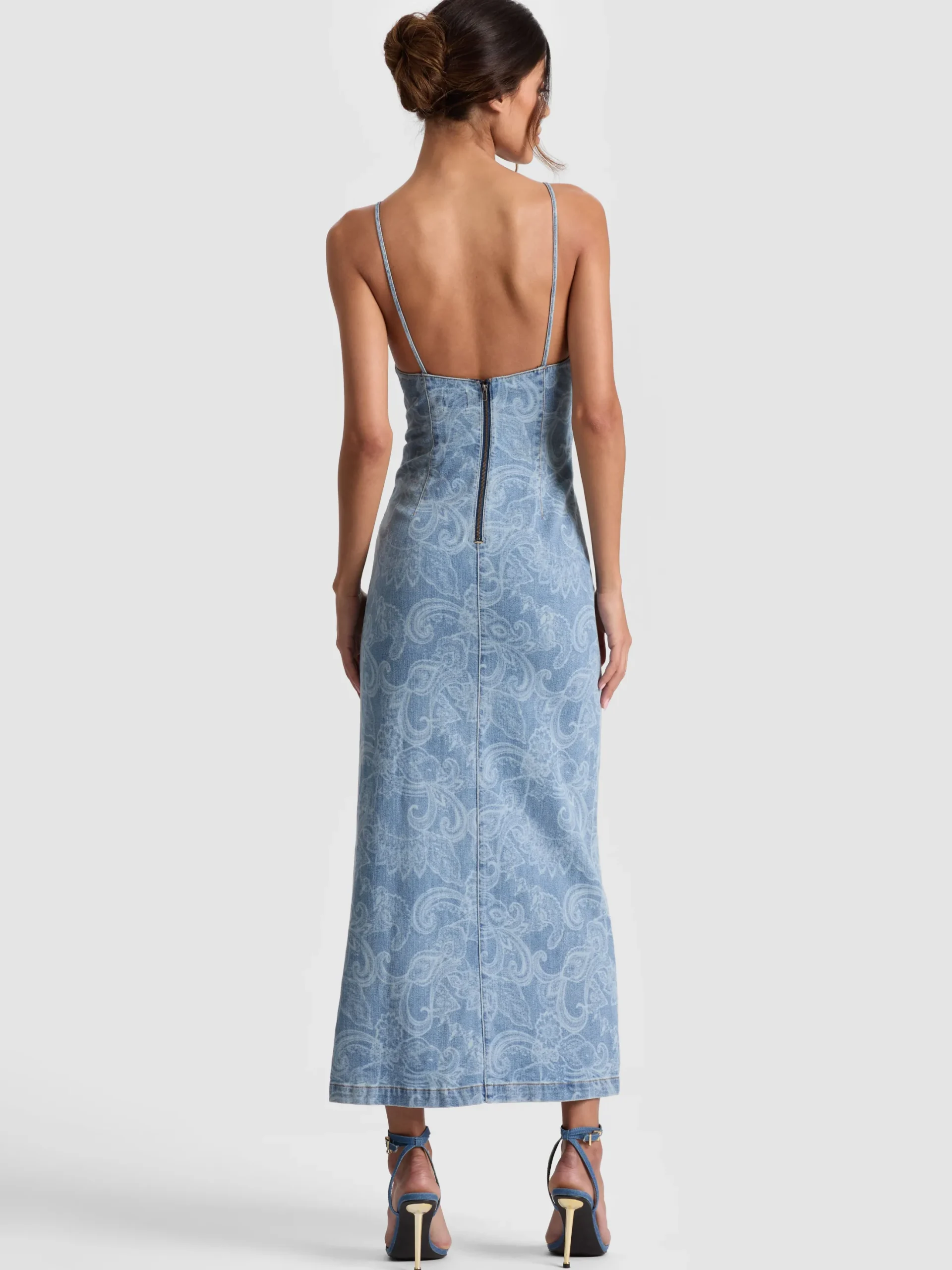 Slip into something less expected. The Julietta dress reimagines one of our signature silhouettes in paisley-printed denim-complete with a V-neckline, a subtle slit, and a body-skimming fit. It’s flirty but not precious and made for mixing into your day-to-night summer wardrobe. Pairs well with hoops, heels, and a little attitude.