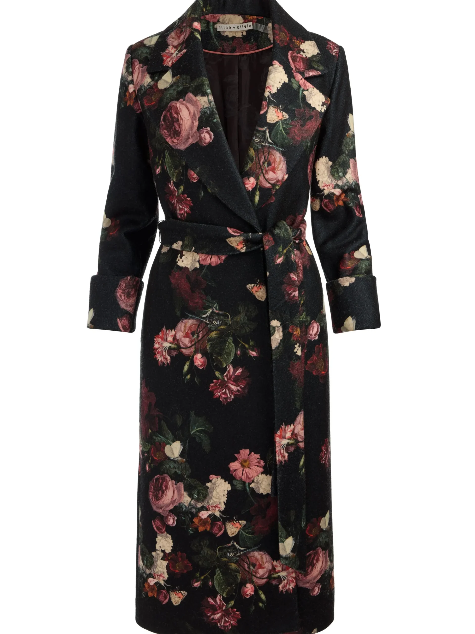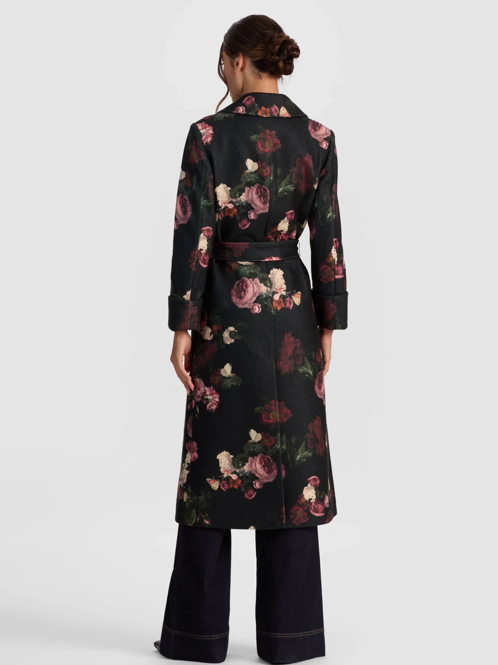 The Karley coat is a fresh spin on outerwear, marrying a classic wrap silhouette with a bold floral wool-blend print. A notch collar and strong shoulders add structure, while the tie belt defines the waist. Falling to a sweeping length, it balances drama with polish. Throw it on over simple separates and let the print do the talking.
