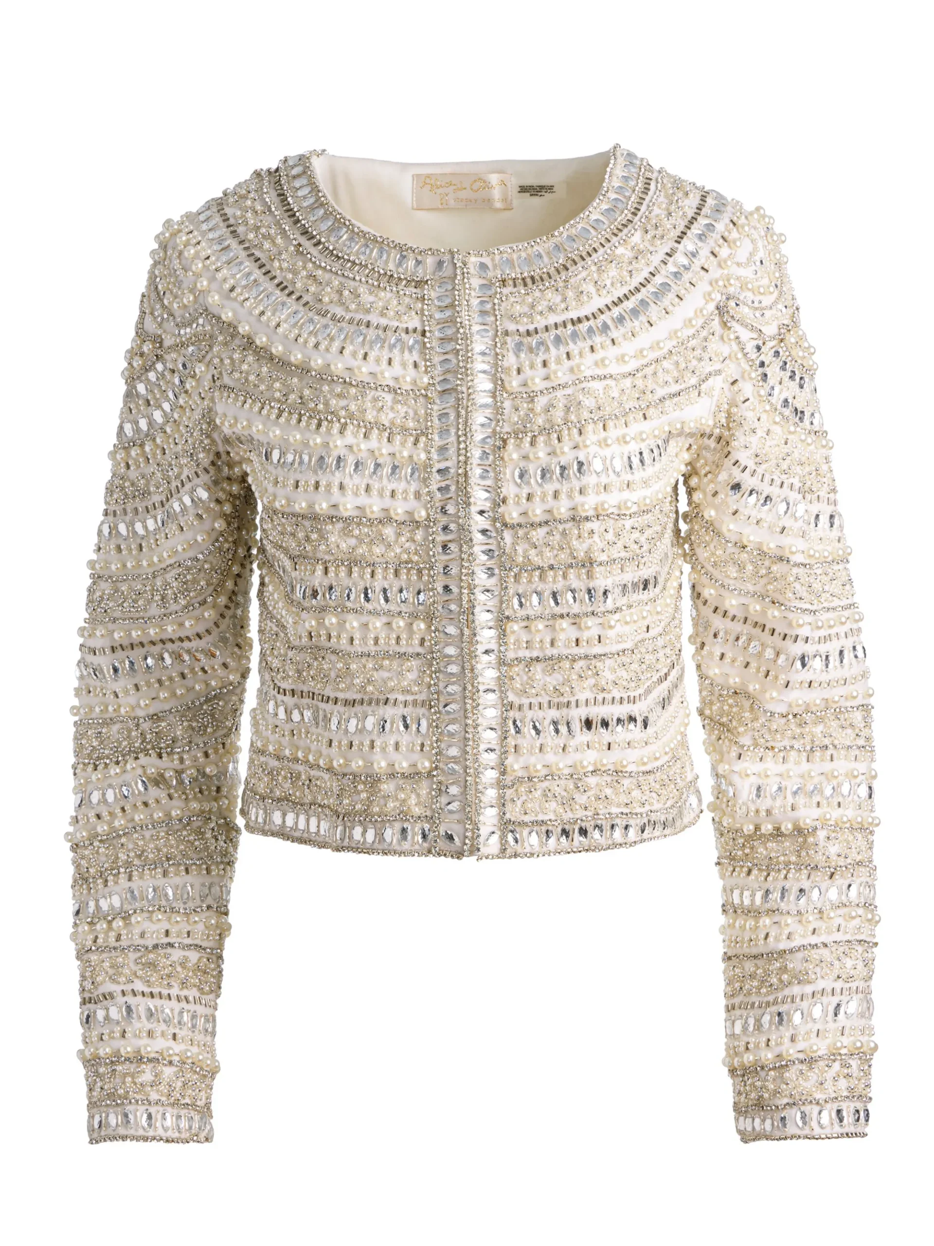 - Hand-embellished pearls, crystals, and beading on organza base