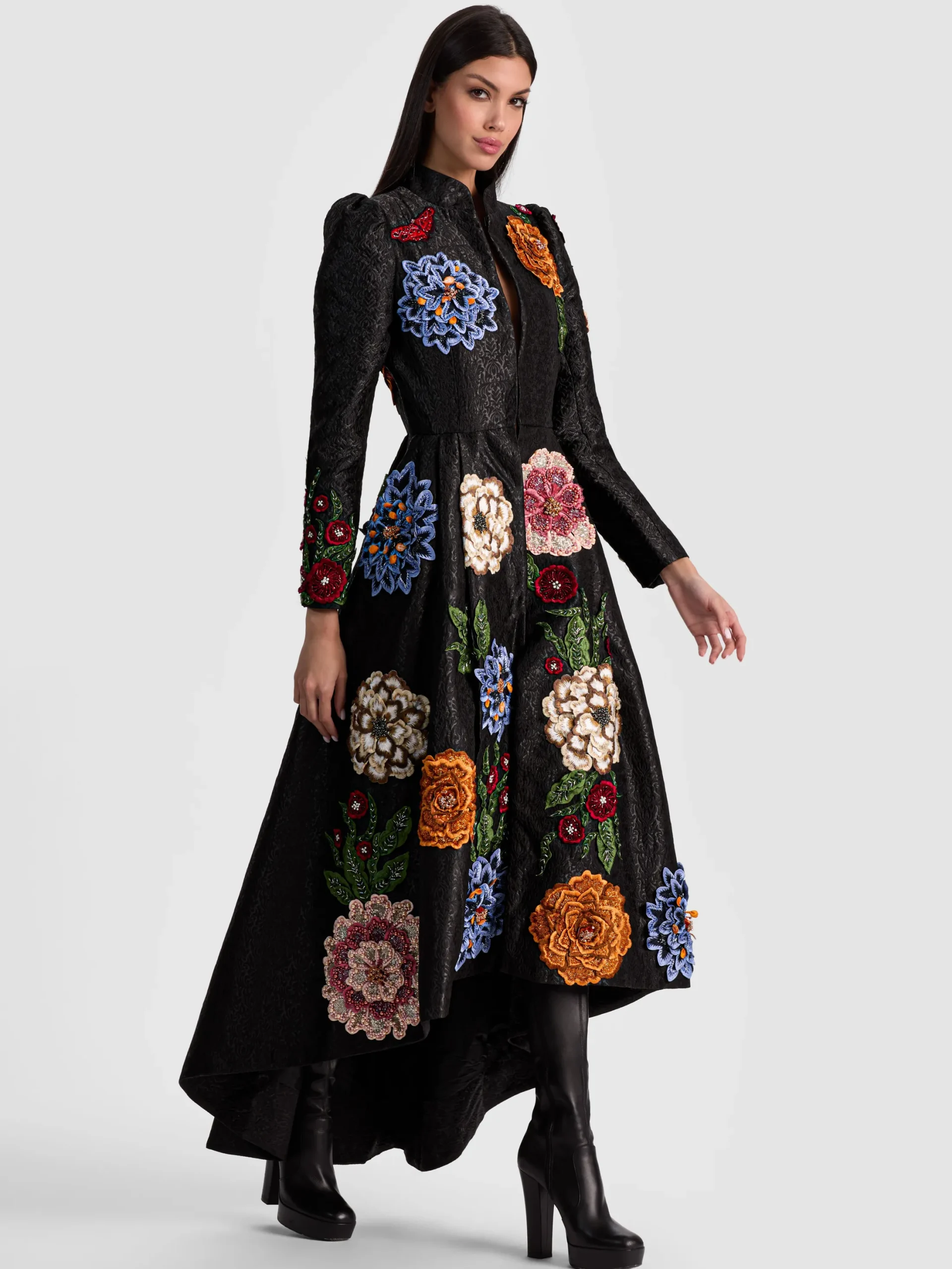 When outerwear becomes the main event. The Renata coat is a show-stopping maxi layer designed in rich damask jacquard with dramatic pleats for graceful movement and volume. 3D floral appliques bloom across the surface, adding depth, texture, and couture-level detailing. A mock neckline and hook-and-eye closures keep the silhouette clean and structured, making it a standout finish over everything from gowns to jeans.