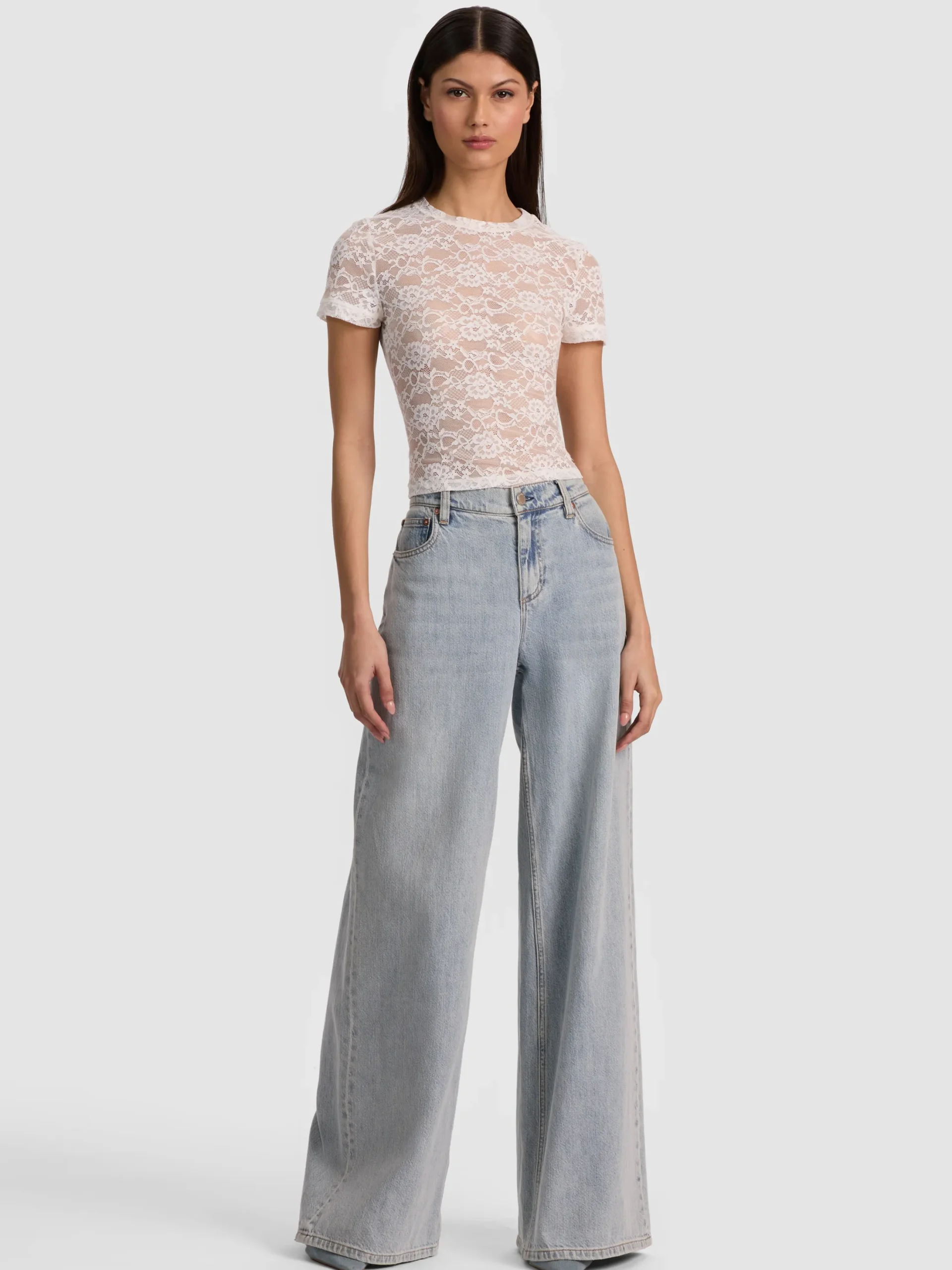 This fitted baby tee is crafted from sheer lace for a delicate, elevated take on a wardrobe staple. The cropped length and crew neckline keep the silhouette clean and modern. It’s perfect for layering–wear it under a blazer and high rise denim for an effortlessly polished look.