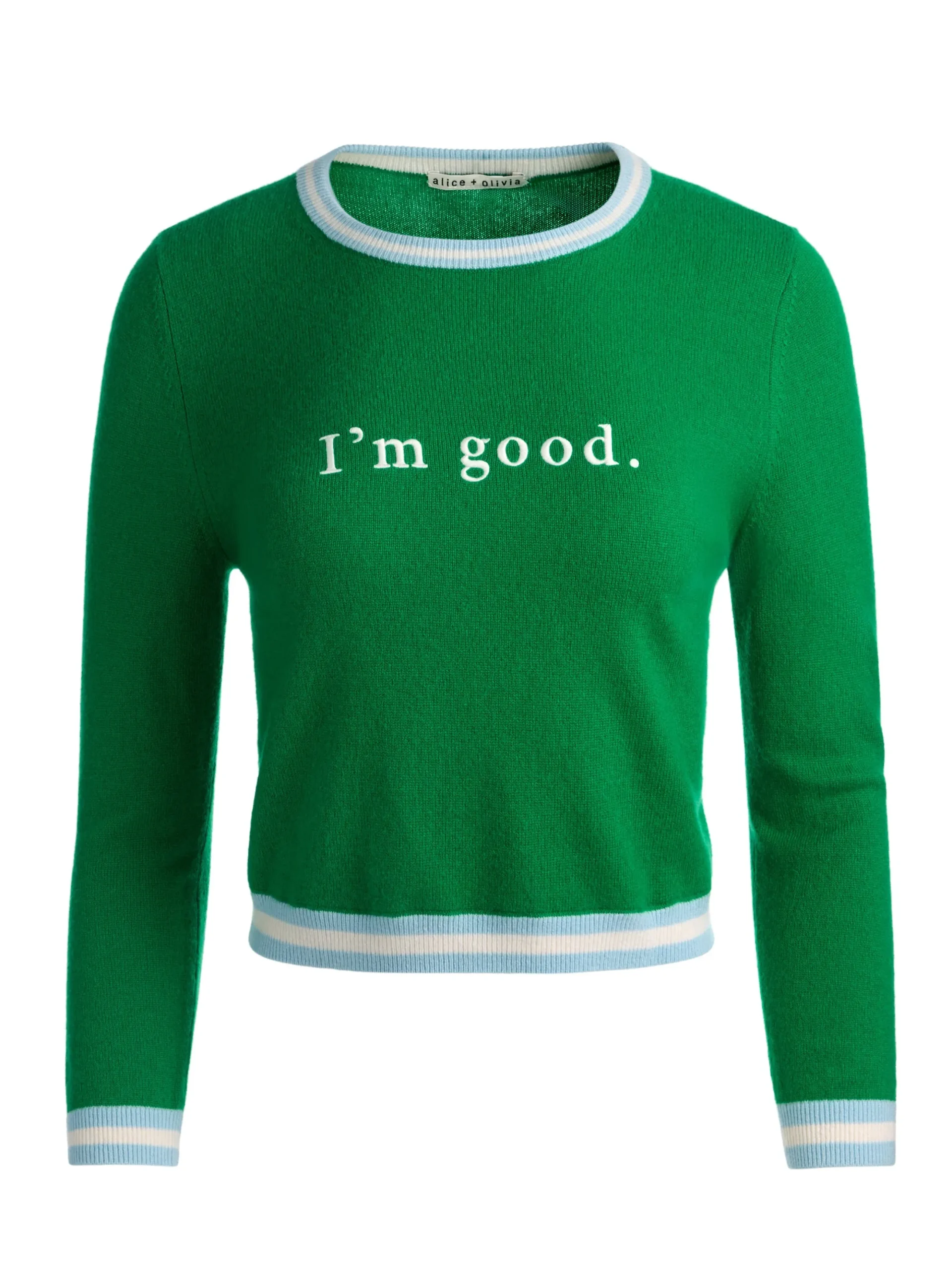 A top that does all the talking for you. Spun from luxe cashmere, our Carolann shrunken sweater fits close and has the perfect cropped body. Embroidered text detailing gives it personality. The green apple hue is bright, happy, and very much the main character. It’s cozy, it’s confident, and, well, good. Wear it with its pleated Emilie skirt for a preppy, fully coordinated look.