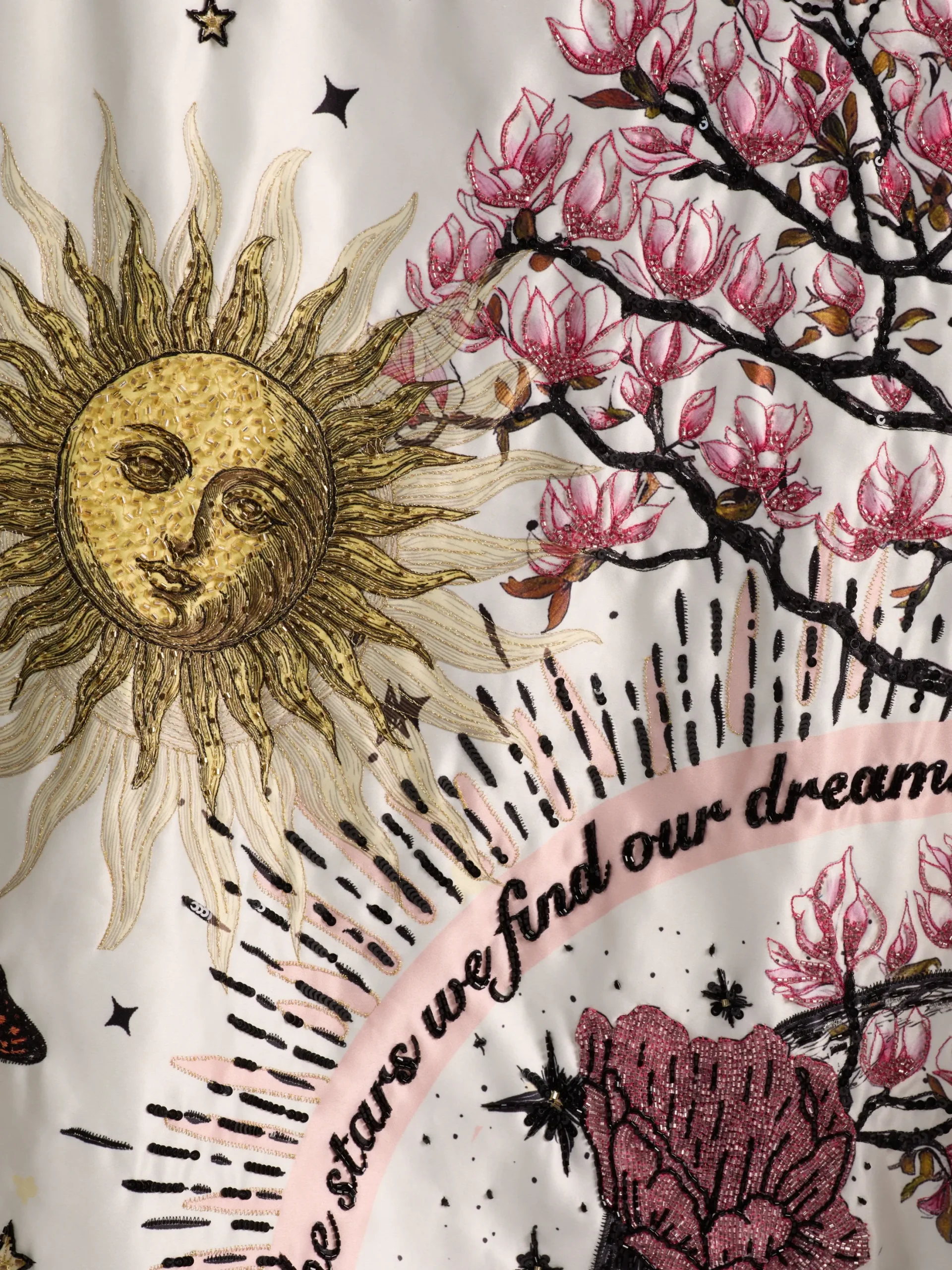 Crafted from printed duchess satin, this bustier gown is adorned with intricate beaded embroidery that adds depth and dimension. The structured bodice is ultra-flattering while the sweeping skirt flows effortlessly to the floor. It’s dramatic without feeling heavy, making it ideal for spring events. Pair it with sleek heels and statement earrings for a truly unforgettable look.
