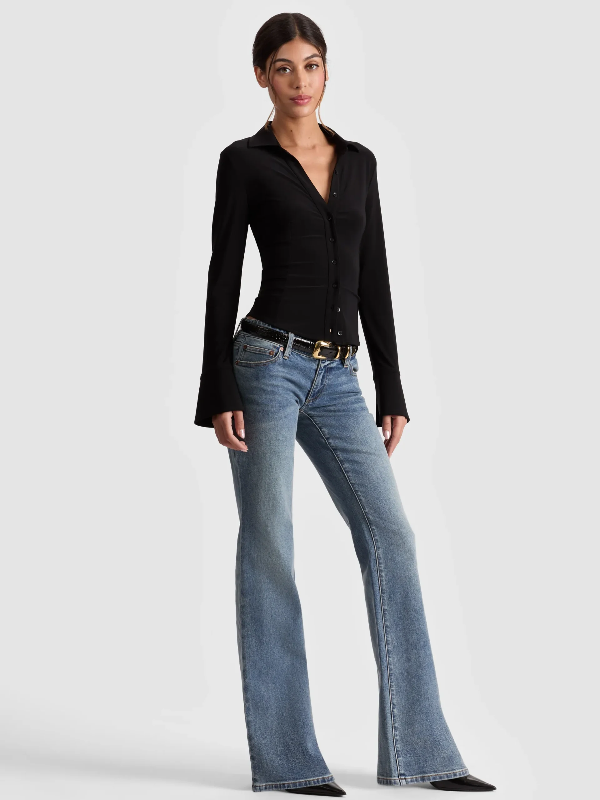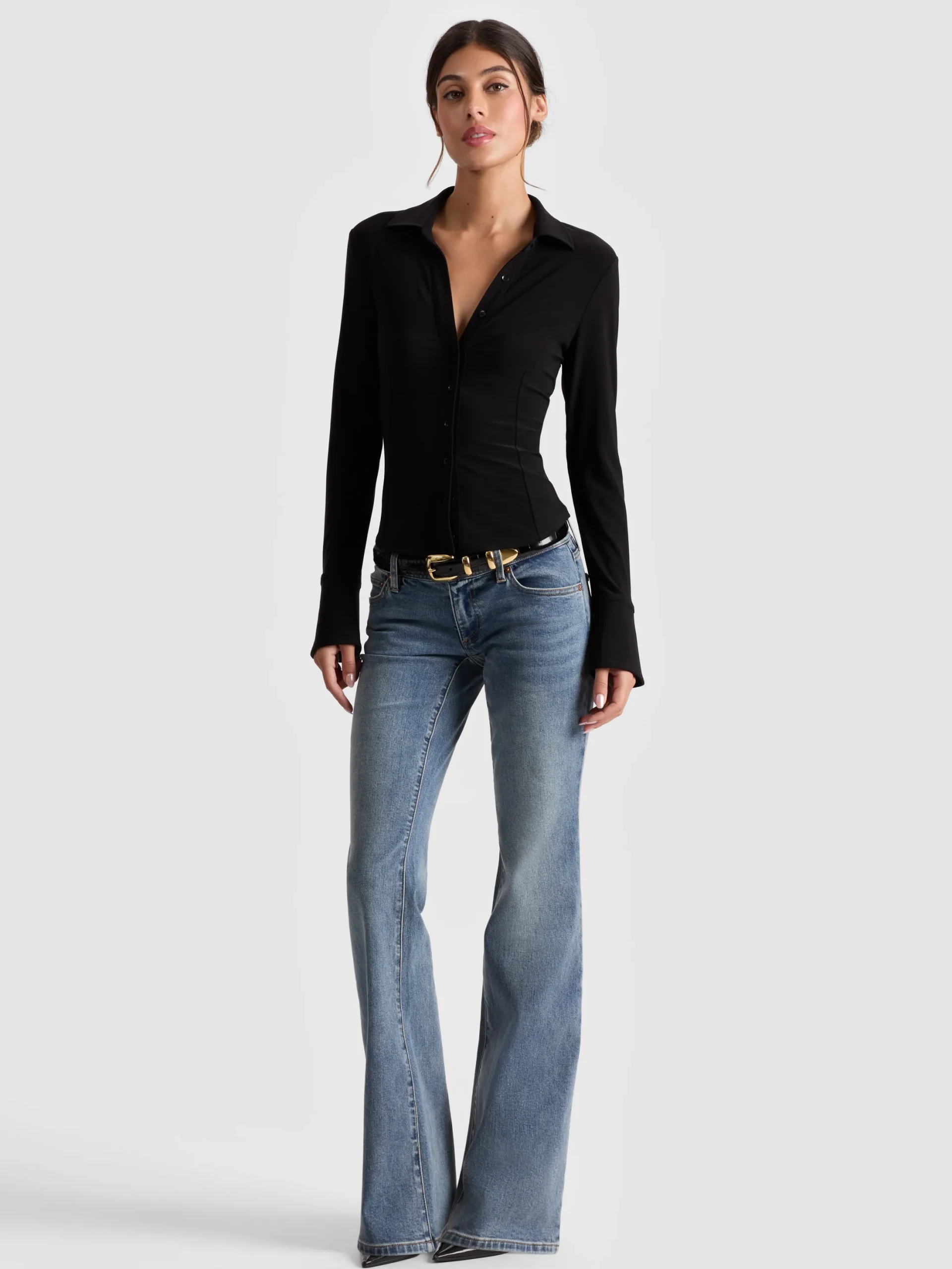 Sleek, sculpted, and endlessly flattering–meet Freya. This fitted black button-down top is crafted in our matte luxe jersey for a smooth, polished feel with just the right amount of stretch. Designed with a nipped-in waist and subtly flared cuffs, it hugs in all the right places while adding a touch of drama. Dress it up, dress it down–either way, Freya makes a statement.