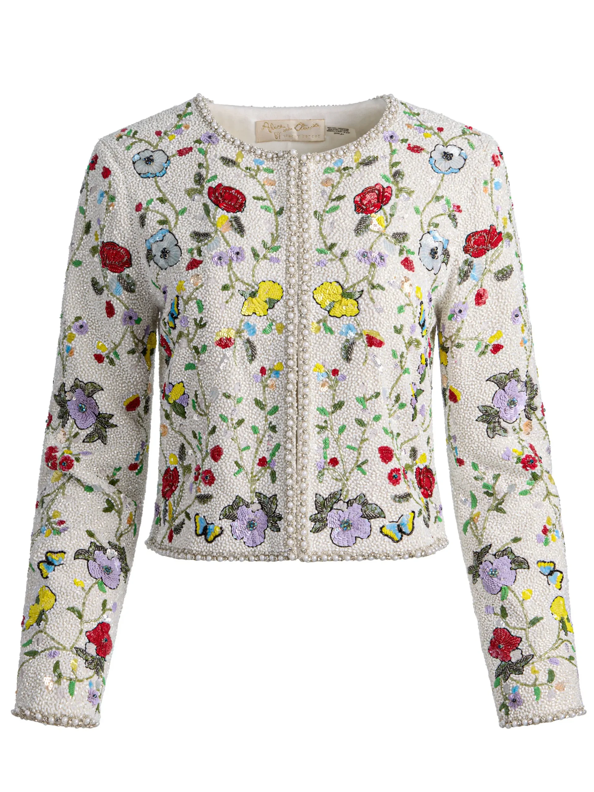 Intricate and unforgettable. This cropped, boxy jacket is covered with exquisite beadwork and sequins over sheer organza, creating dimension from every angle. Pearled trim refines the silhouette, while discreet hook closures keep the finish seamless. It pairs beautifully with the coordinating dress, but just as easily elevates denim. A true conversation piece.