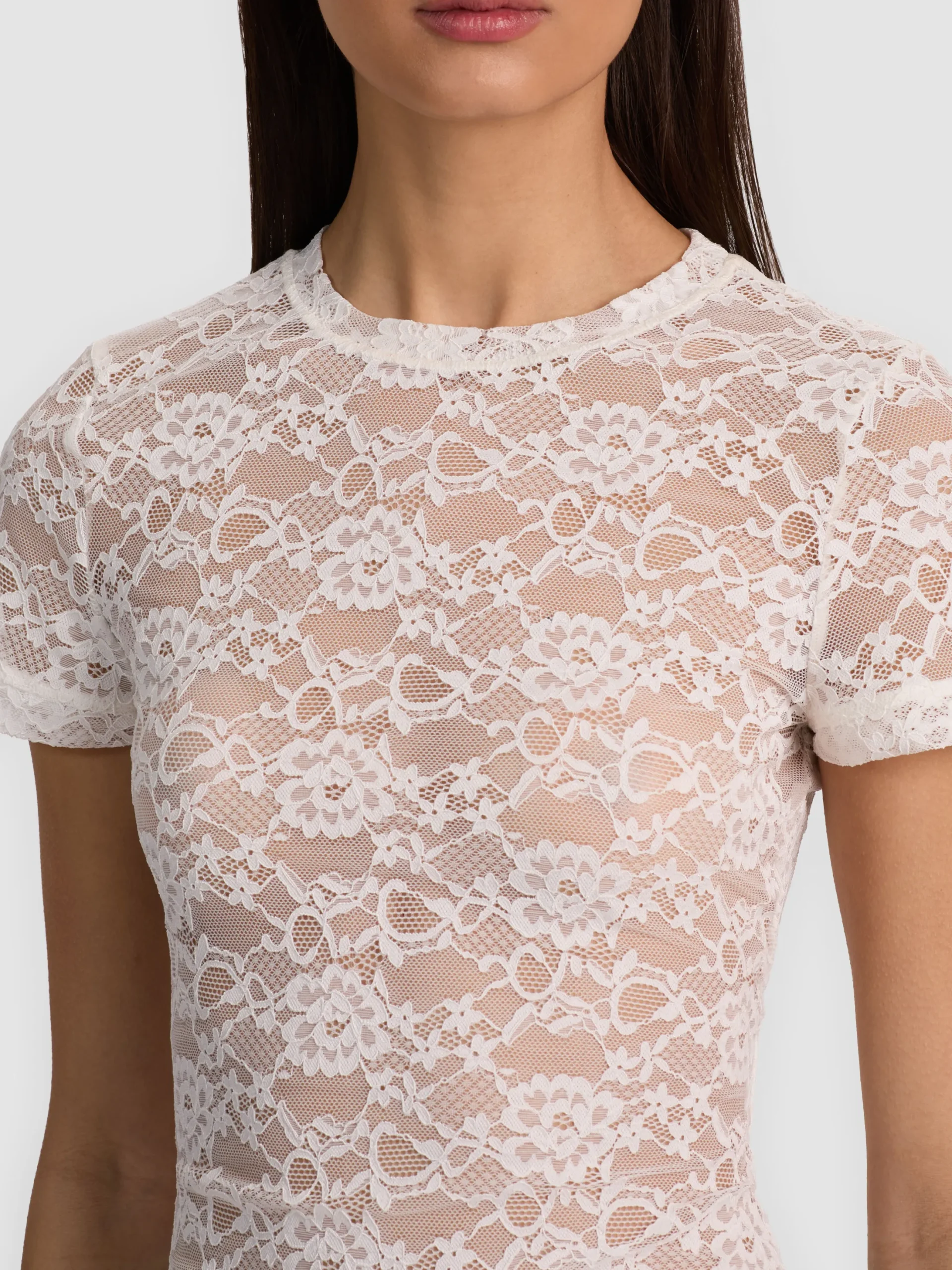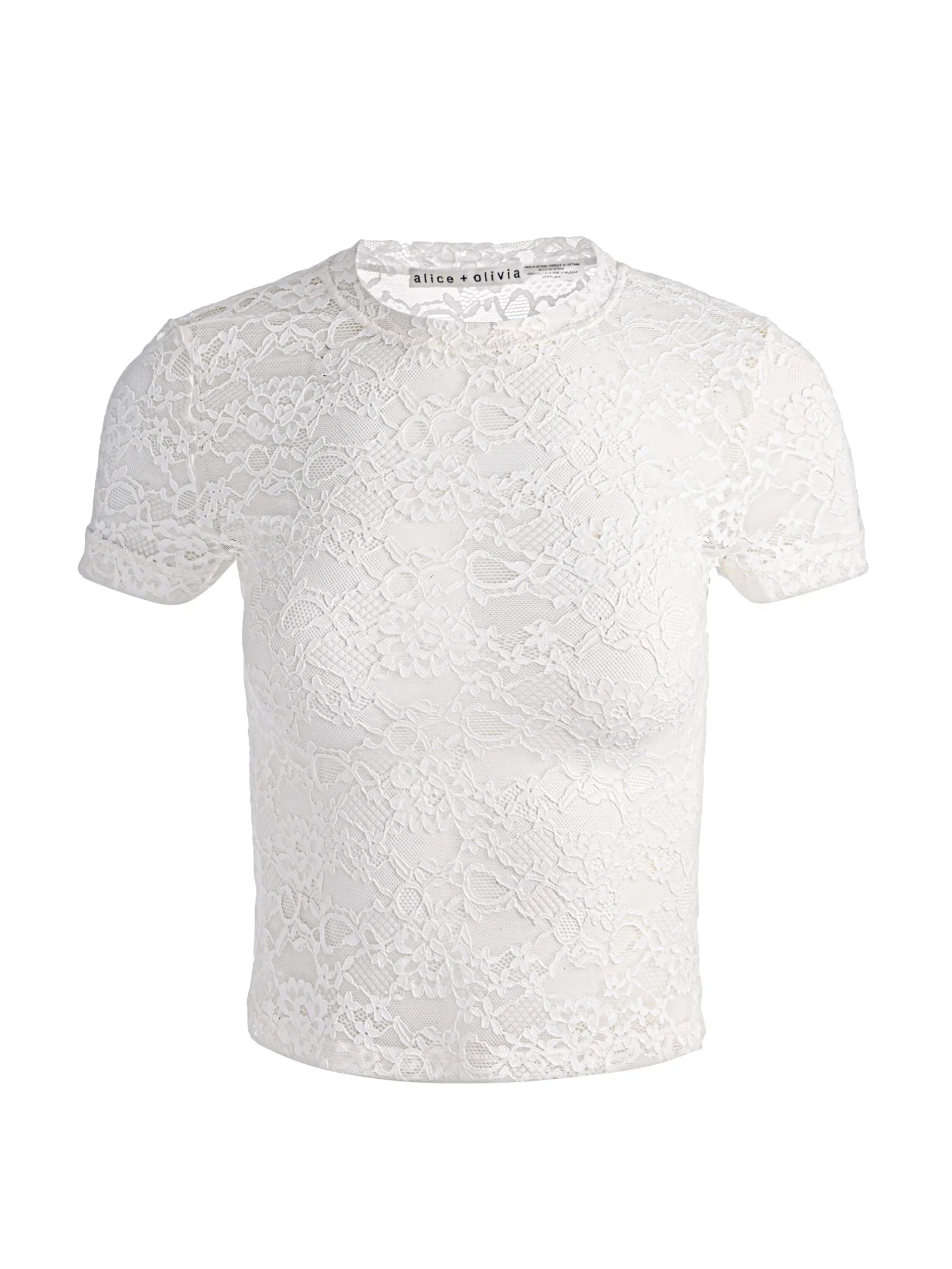 This fitted baby tee is crafted from sheer lace for a delicate, elevated take on a wardrobe staple. The cropped length and crew neckline keep the silhouette clean and modern. It’s perfect for layering–wear it under a blazer and high rise denim for an effortlessly polished look.